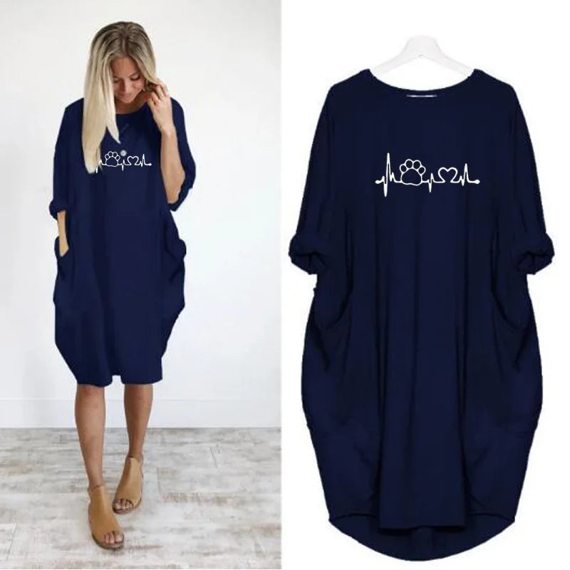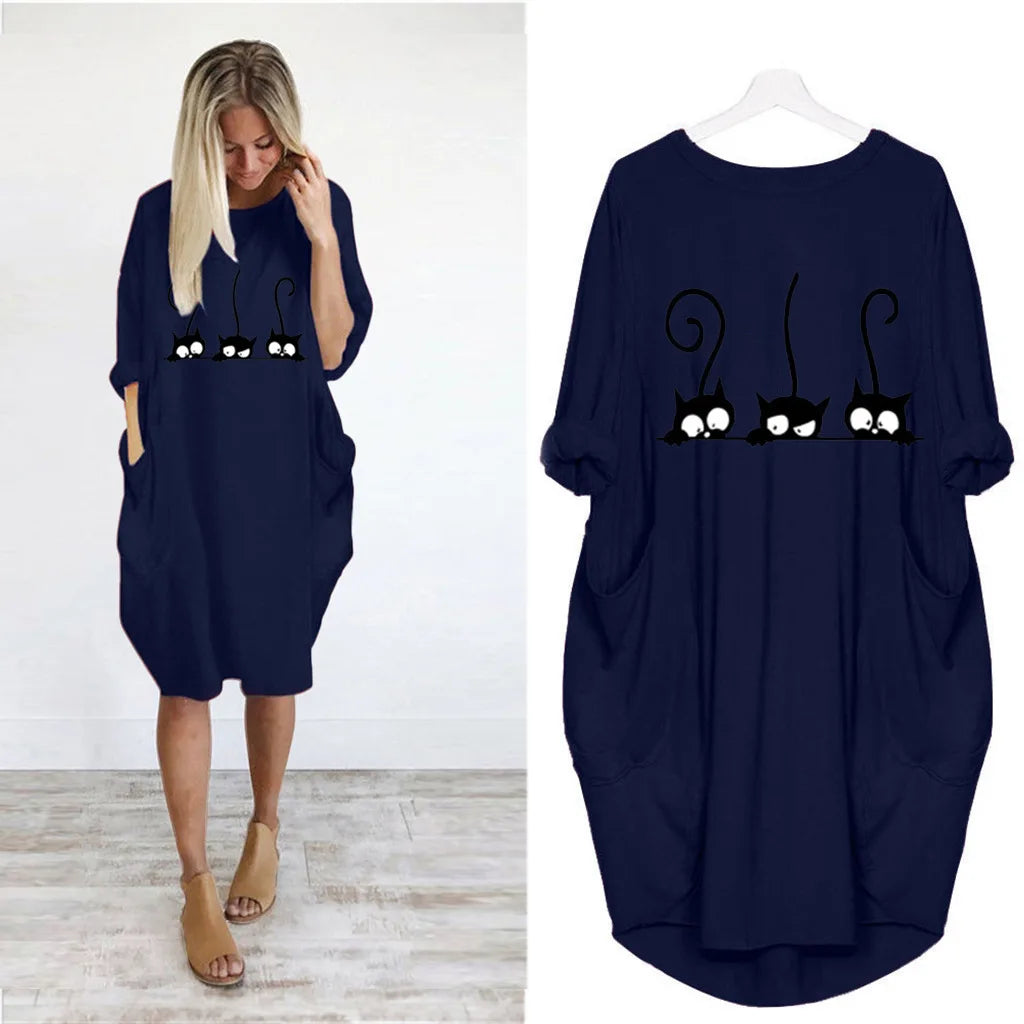A relaxed long-sleeve dress made from a soft polyester-cotton blend. The dress features a round neckline, side pockets, and a playful black cat print on the front. Designed with a loose, comfortable fit that falls just below the knees. Suitable for casual wear across multiple seasons.